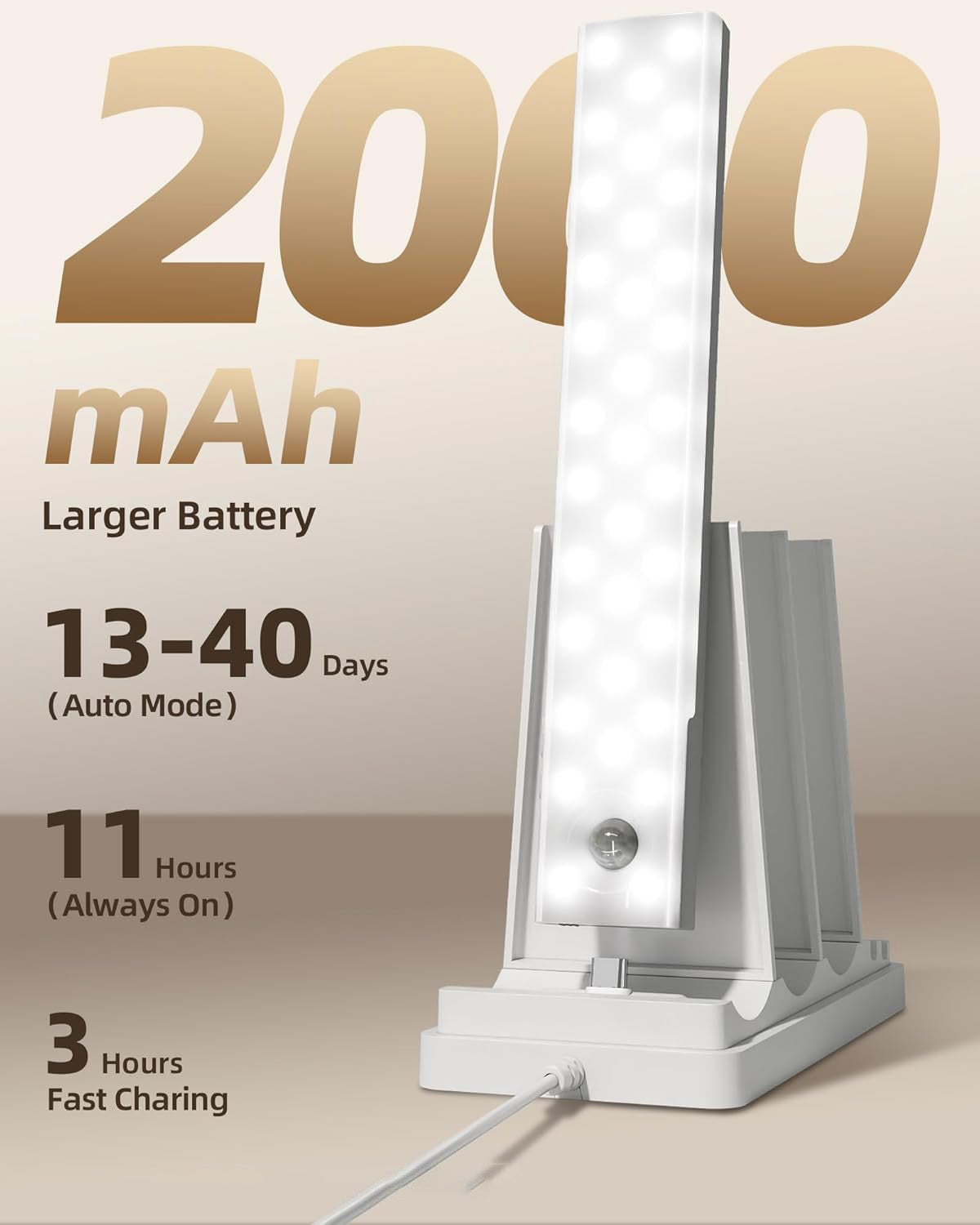 The 2000mAh rechargeable battery lasts up to 13-40 days in sensor mode or up to 11 hours at full brightness in constant on mode. The three-slot USB-C charging base allows you to charge multiple lights at once, and even charge your phone or earphones if needed.