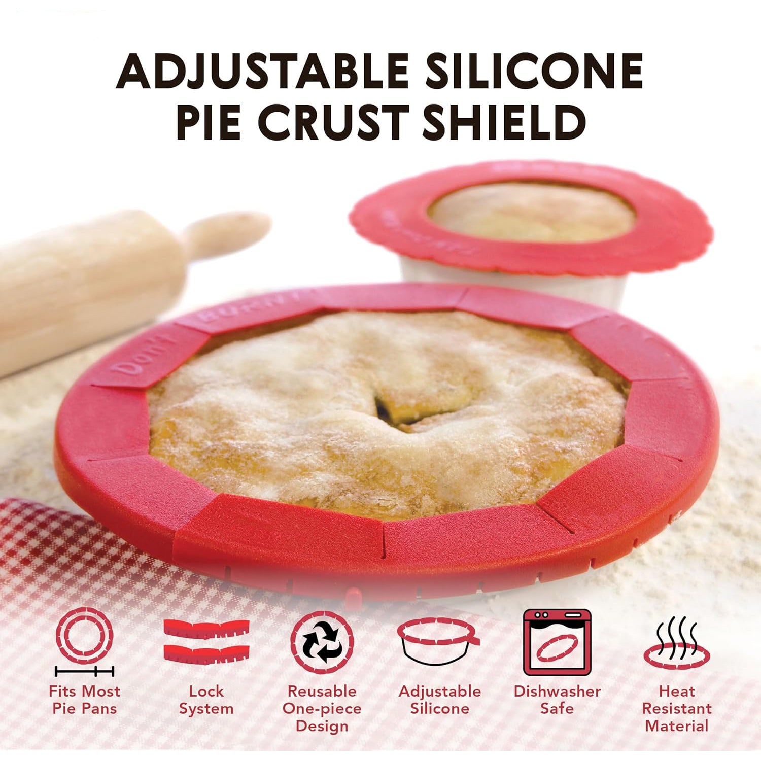 The silicone shield is flexible and adjustable, fitting pies ranging from 8 to 11 inches, including rimmed varieties.