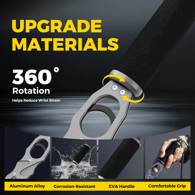 Combines a heavy-duty fish lip gripper and a built-in scale (up to 40 lbs/16 kg). The 360° rotating handle ensures easy weighing from any angle, reducing hand fatigue.