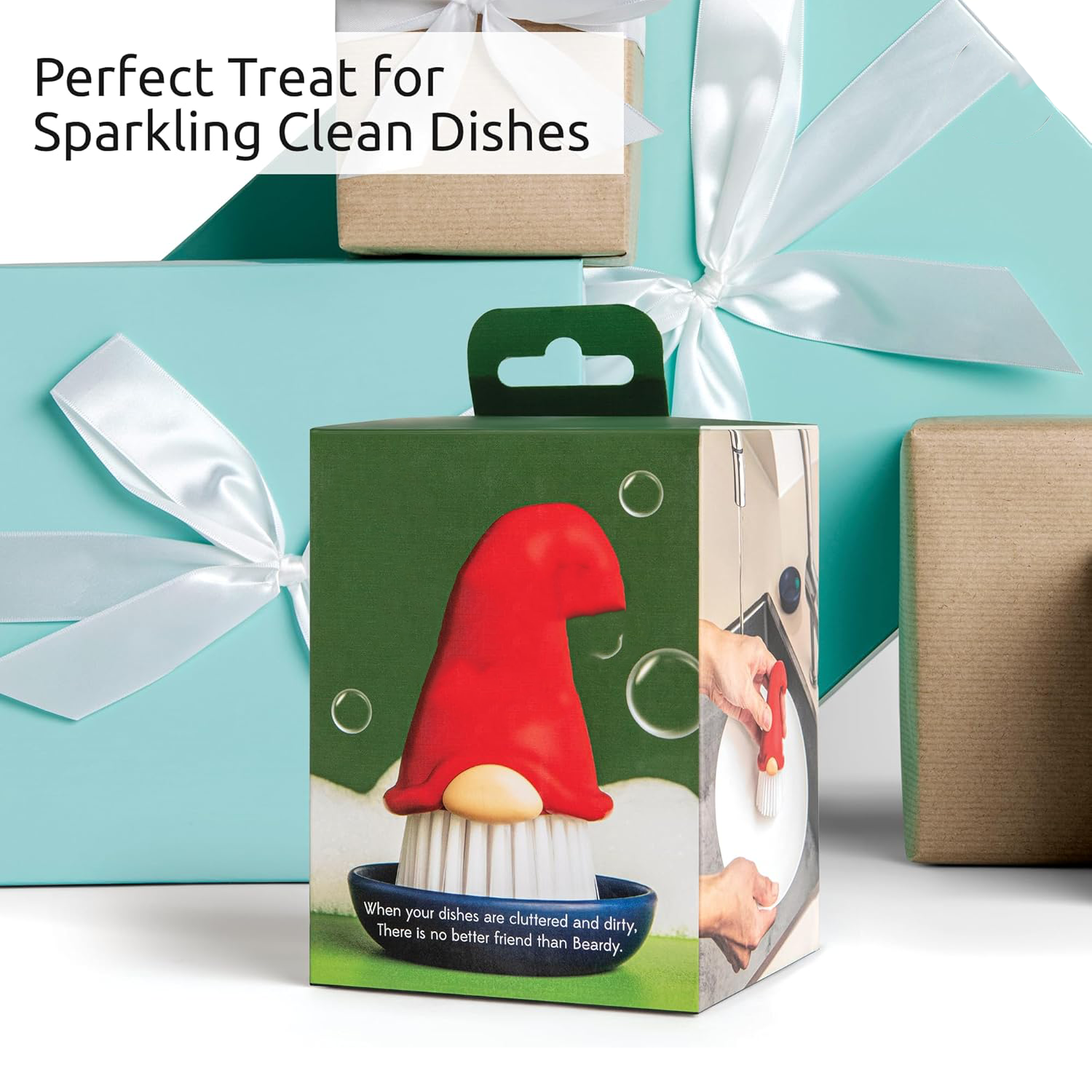Crafted into a friendly dwarf figure with a textured “beard” made of durable scrubbing fibers, blending fun with functionality.