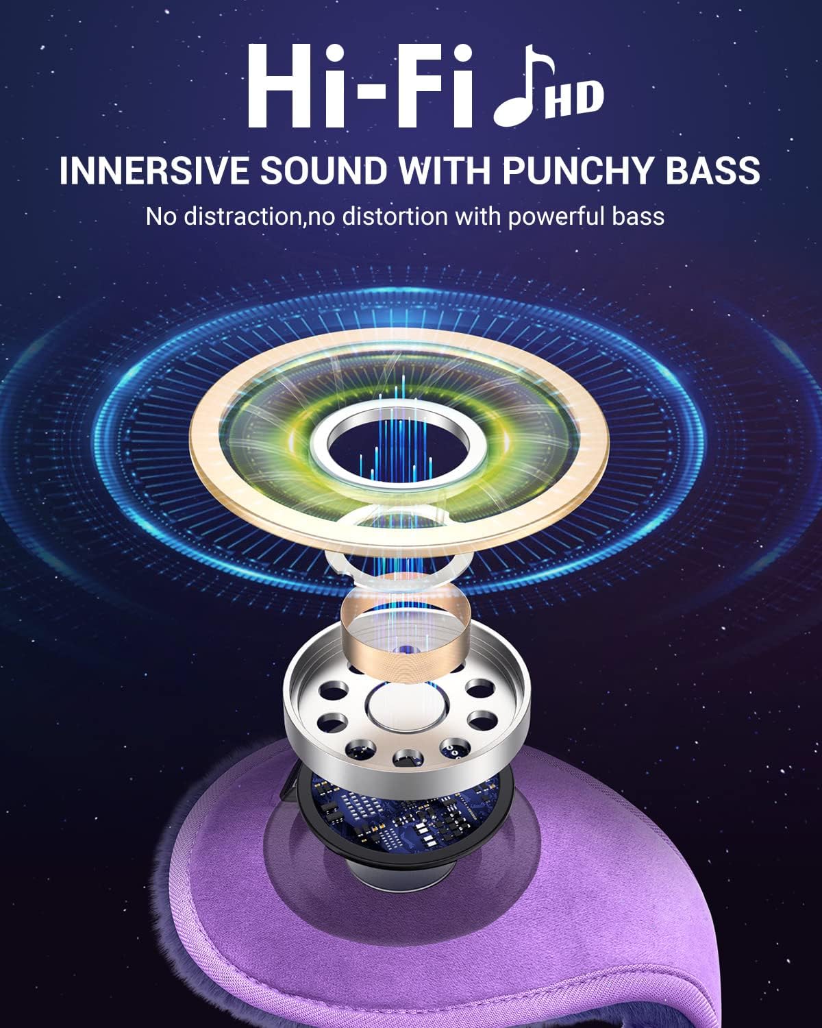 Features flat silicone ear pads and ultra-soft fabric for all-day comfort without pressure on ears or head, suitable for both indoor and outdoor use.