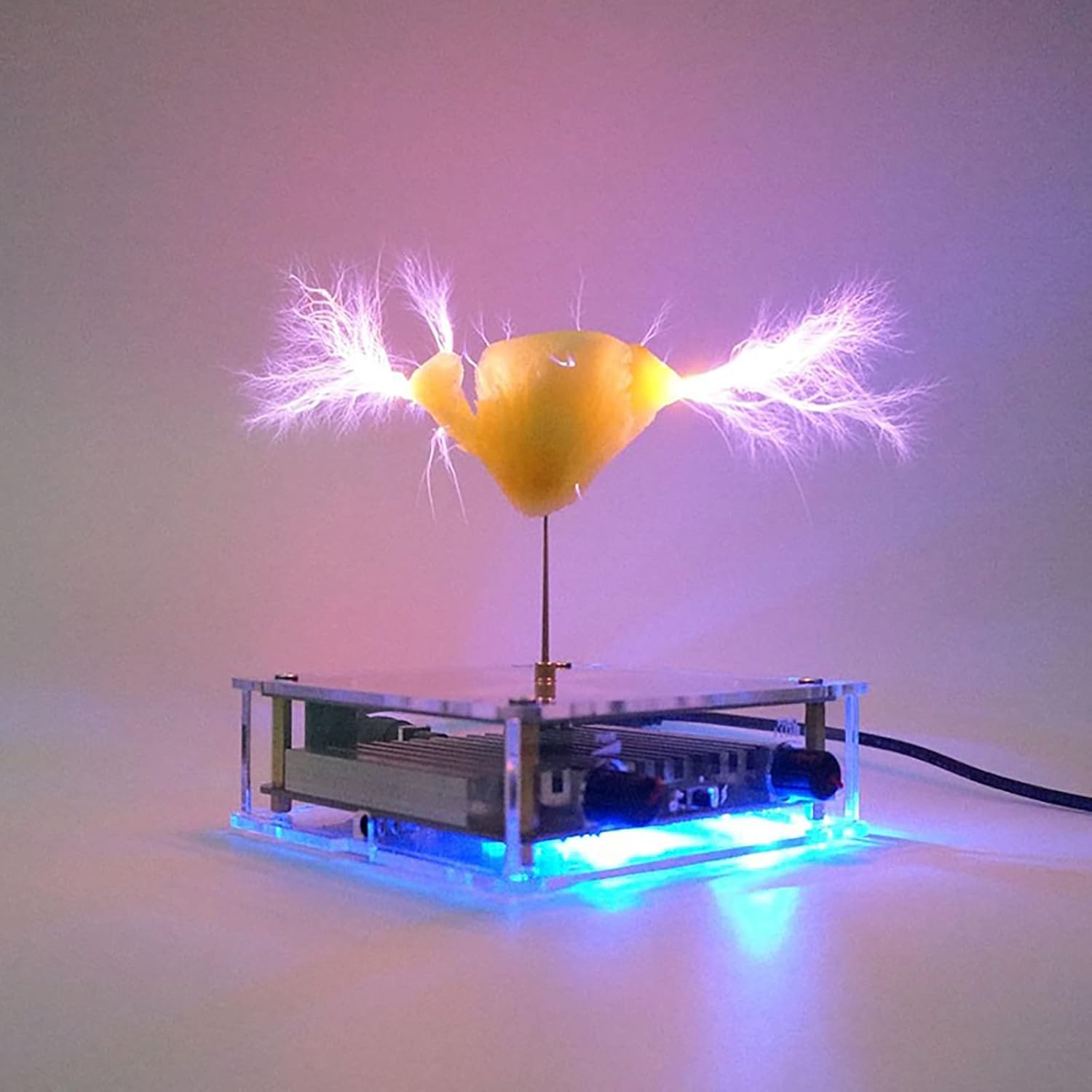 Produces visible electric arcs through solid-state Tesla coil technology, creating a stunning light show synchronized with music.