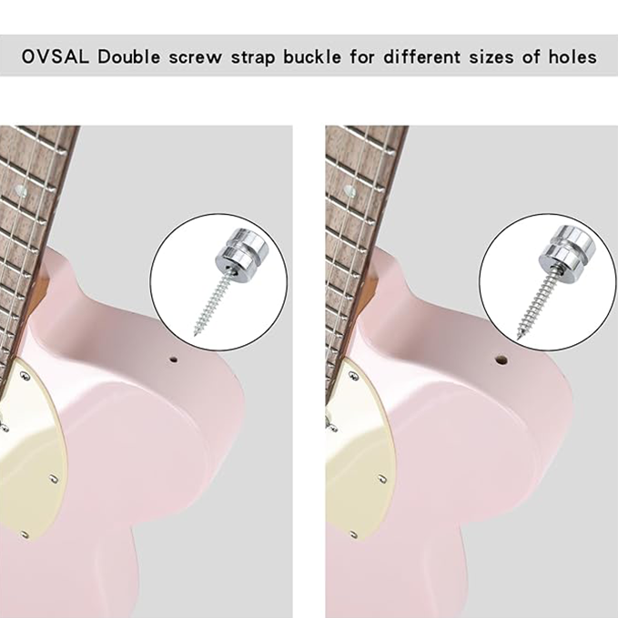 The Electric Guitar and Bass Safety Strap Lock is a reliable and durable accessory designed to secure your instrument strap during performance. Featuring a flat head design with a 5.34 mm screw head diameter and a sleek chrome-plated finish, this strap lock is compatible with classic acoustic-electric guitars and basses such as Fender Stratocaster, Telecaster, Les Paul, and Classical models. It provides enhanced safety and peace of mind for musicians of all levels.