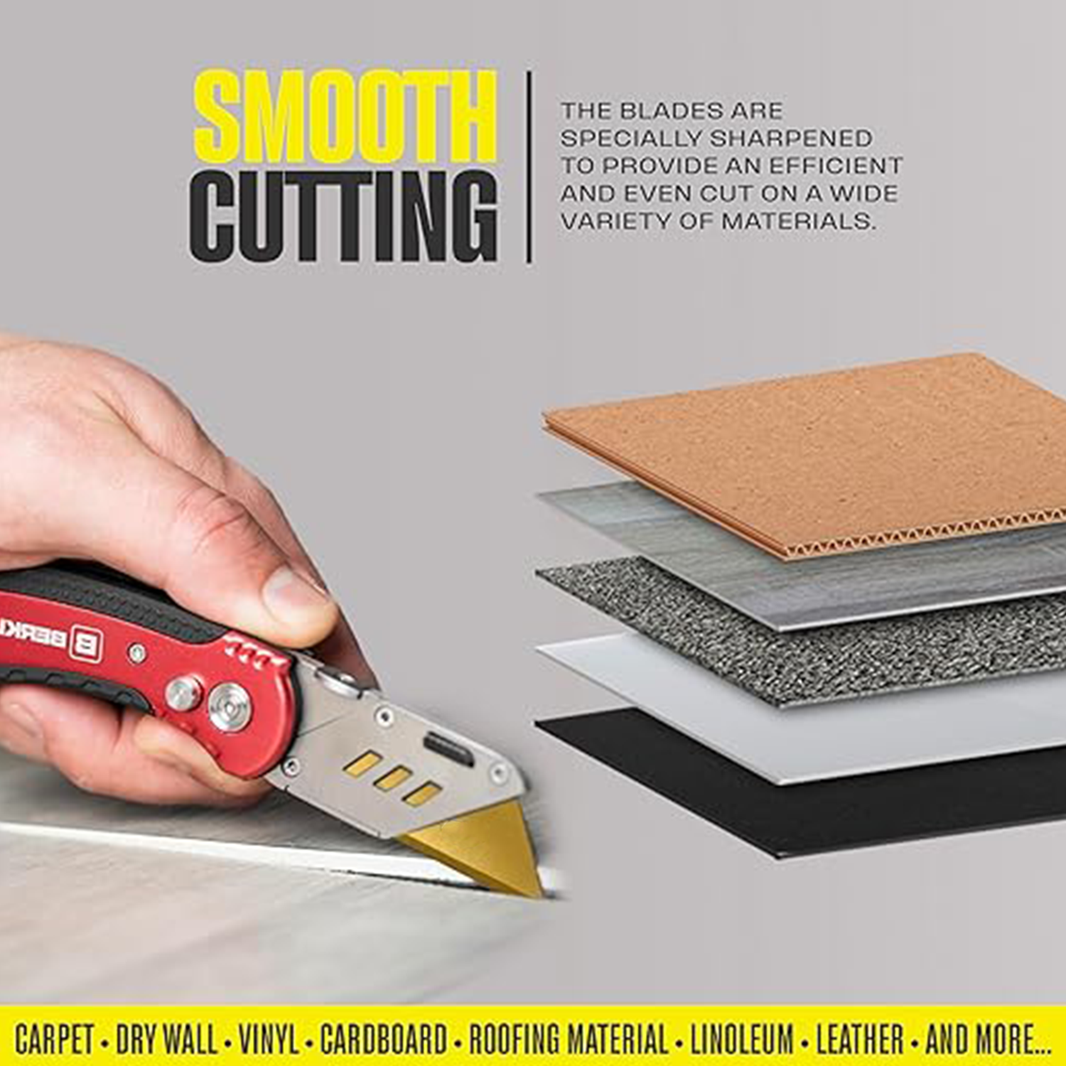 Efficiently cuts through cardboard, plastic, rubber, thin metals, rope, carpet, vinyl, and other common workshop or job-site materials.