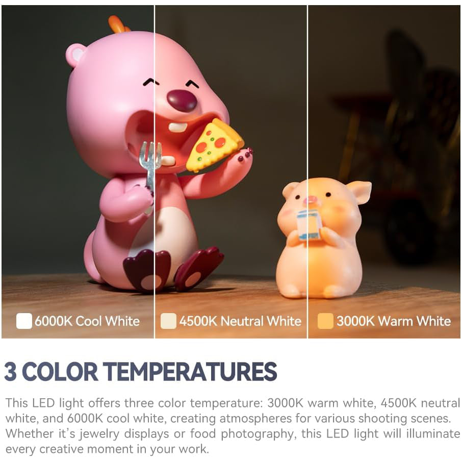 Offers 3000K warm white, 4500K neutral white, and 6000K cool white light, ideal for creating the perfect atmosphere for jewelry displays, food photography, and still life shots.