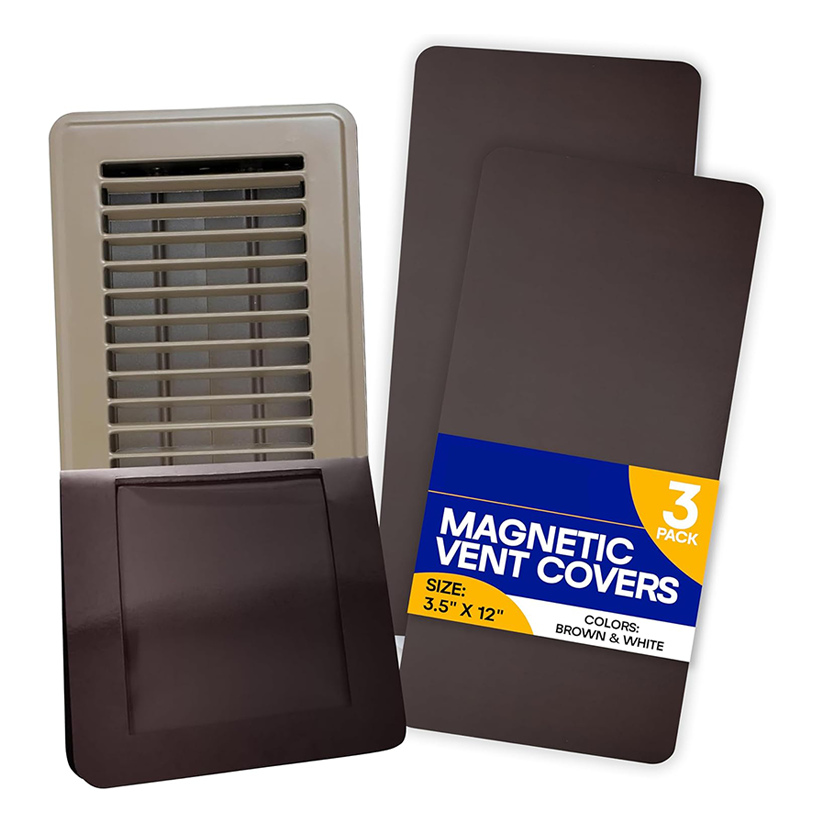 Magnetic Vent Covers (3-Pack) are versatile and easy-to-use covers designed to completely seal floor, wall, or ceiling vents and registers. Featuring strong magnetic edges and an integrated pocket for an additional insulation layer, these 5.5 x 12 inch brown covers help improve energy efficiency by preventing drafts and directing airflow where it's needed—ideal for homes, RVs, and HVAC systems.