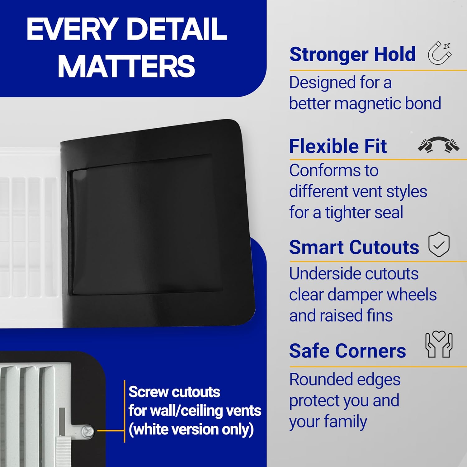 Edges are embedded with powerful magnets that adhere securely to metal vent grilles, creating an airtight seal to block unwanted airflow.