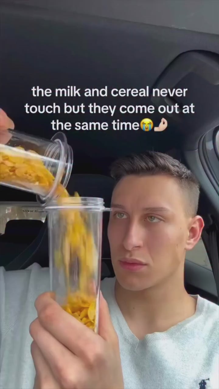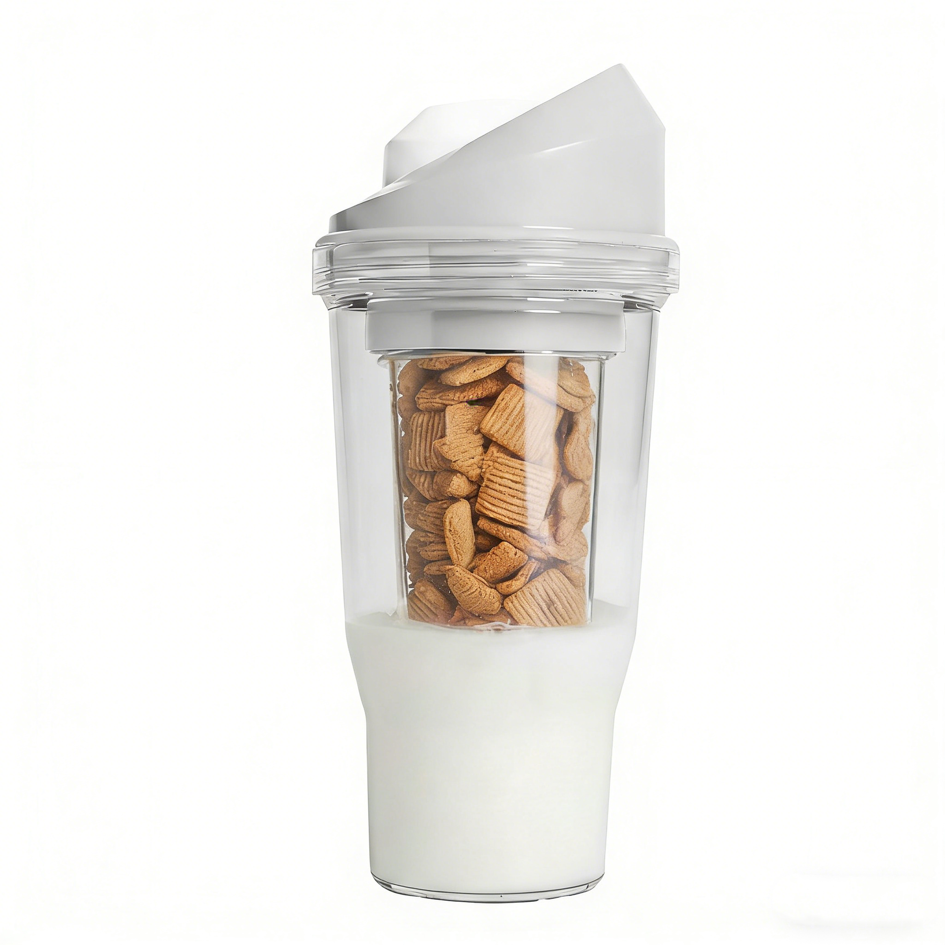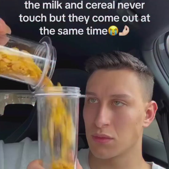 Made of two separate cups—one for cereal and one for milk—ensuring the cereal and milk don’t mix until you’re ready to eat. No spoon required, just enjoy your cereal with one hand wherever you are.