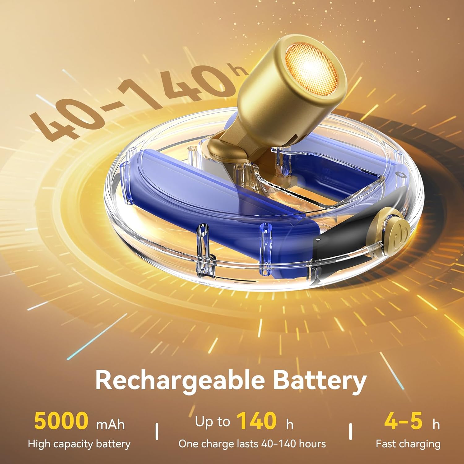 Built-in 5000mAh battery delivers up to 40 hours at maximum brightness and up to 140 hours at low brightness. Fully recharges in 4β5 hours with standby time up to 6 months.