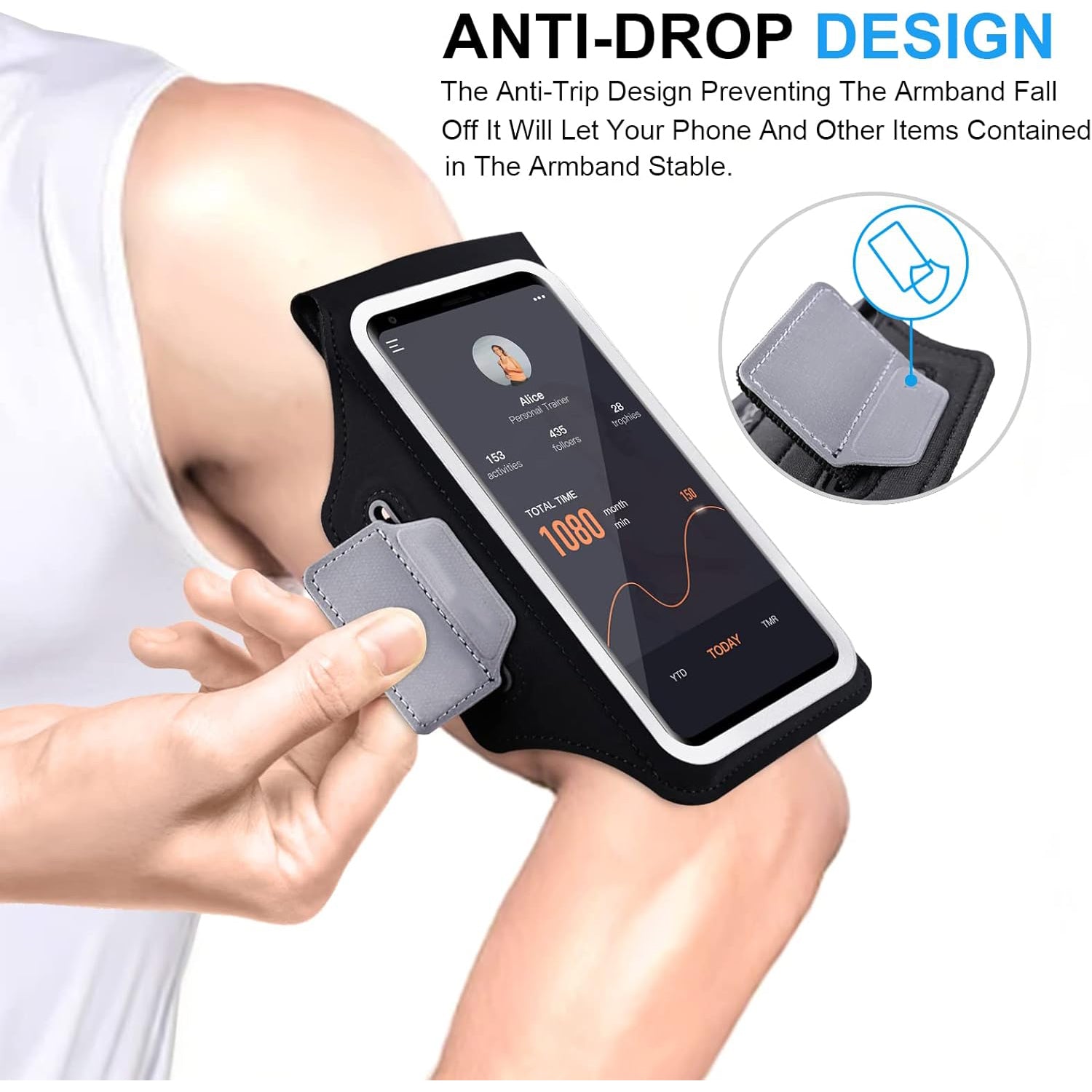 The armband is equipped with a secure anti-drop buckle to keep your phone safe during intense workouts. The reflective strips around the screen enhance visibility at night, making it ideal for runners and outdoor enthusiasts.