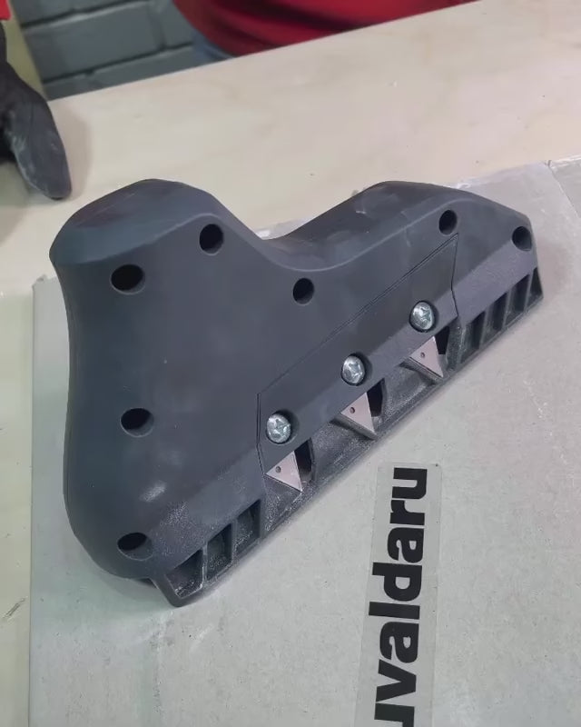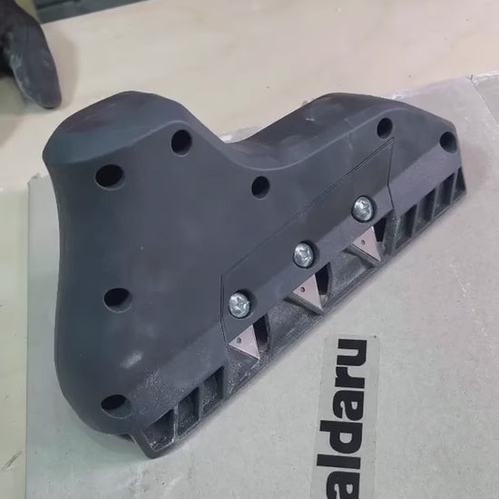 This triple blade planer is designed for smooth transitions between gypsum boards of 9.5mm and 12.5mm thickness, facilitating easy and quick filling afterwards. The black front edge features a perfect 35° angle, allowing you to achieve precise cuts effortlessly.